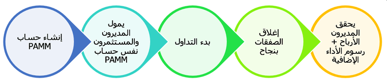 ولاحقًا، عندما تثبت استراتيجيات المدير نجاحها ويثمر التداول عن أرباح، سيربح مستثمر PAMM أرباحًا بناء على مبلغ استثماره. وبعد ذلك، يُطلب من مستثمر PAMM دفع مبلغ معين من رسوم الأداء لحساب مدير PAMM مقابل الخدمات التي قدمها.